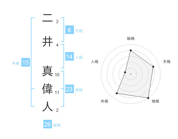 二井 真偉人さんの総格は29画の4点!