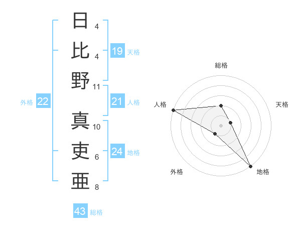 日比野 真吏亜さんの総格は43画の2点!