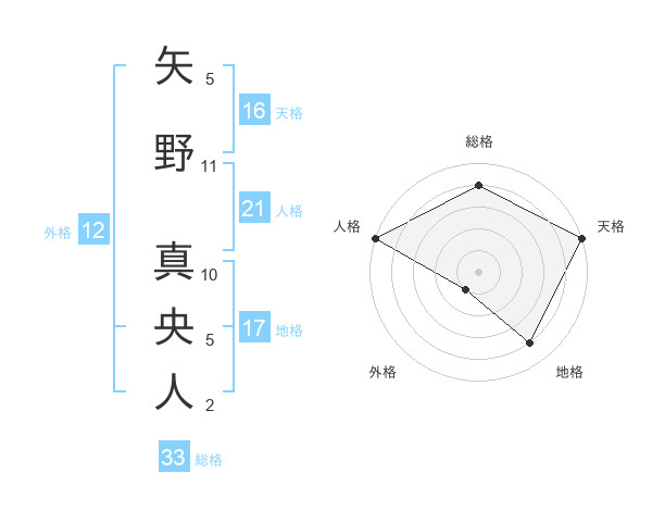 矢野 真央人さんの天格は16画の5点!