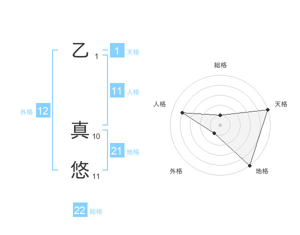 乙 真悠さんの総格は22画の1点!