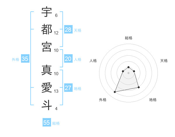 宇都宮 真愛斗さんの総格は55画の1点!