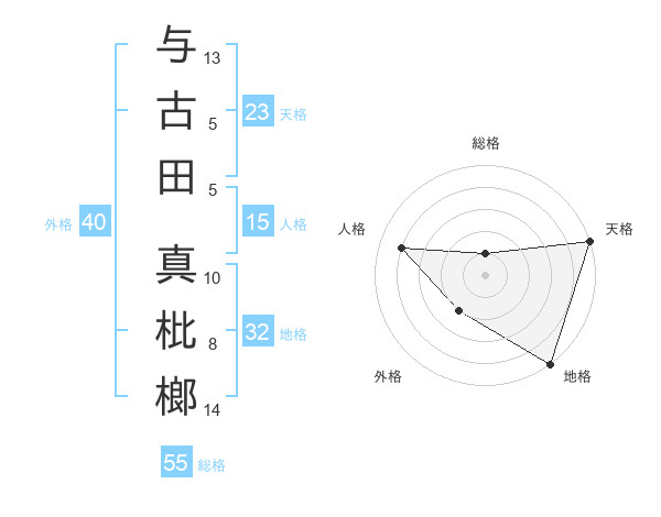 与古田 真枇榔さんの天格は23画の5点!