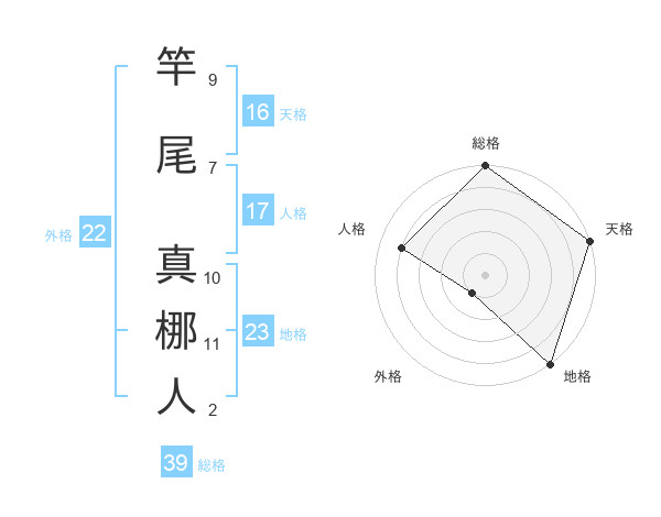 竿尾 真梛人さんの総格は39画の5点!