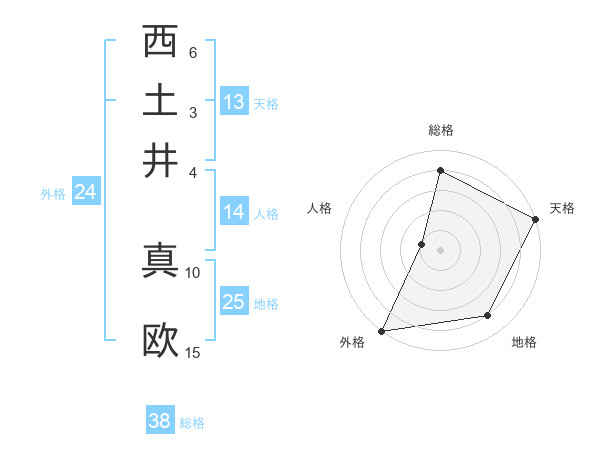 西土井 真欧さんの総格は38画の4点!