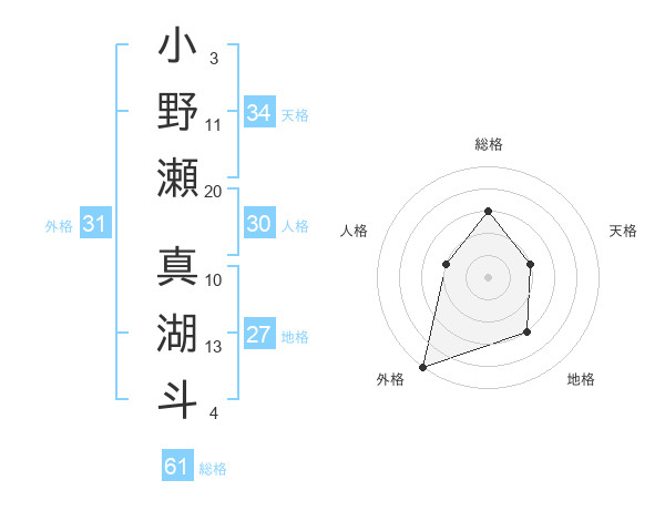 小野瀬 真湖斗さんを姓名の画数から五運を鑑定