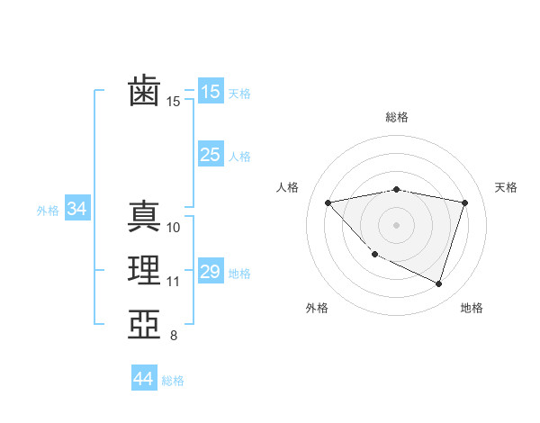 歯 真理亞さんの総格は44画の2点!
