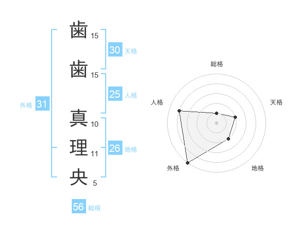 歯歯 真理央さんの外格は31画の5点!