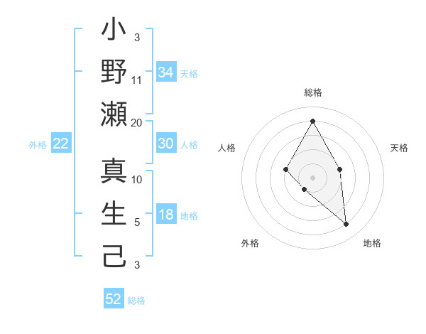 小野瀬 真生己さんの総格は52画の4点!