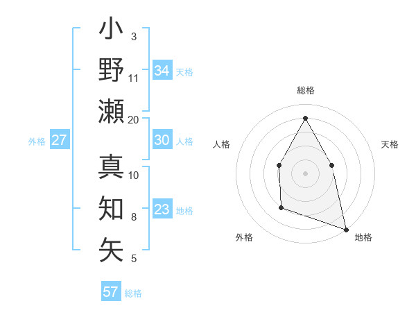 小野瀬 真知矢さんの総格は57画の4点!