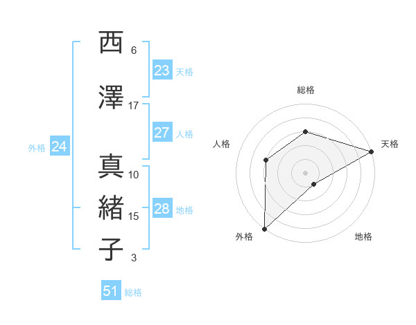 西澤 真緒子さんを姓名の画数から五運を鑑定
