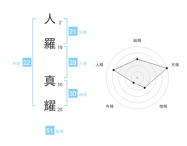 人羅 真耀さんの総格は51画の3点!
