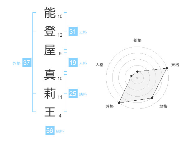 能登屋 真莉王さんを姓名の画数から五運を鑑定