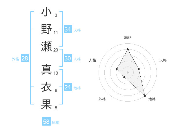 小野瀬 真衣果さんの総格は58画の4点!