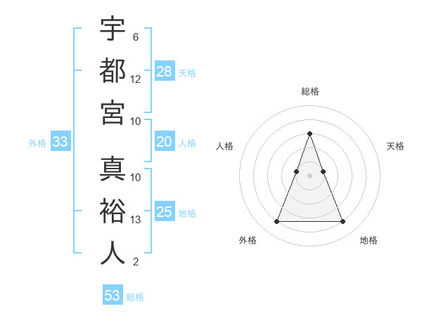 宇都宮 真裕人さんを姓名の画数から五運を鑑定