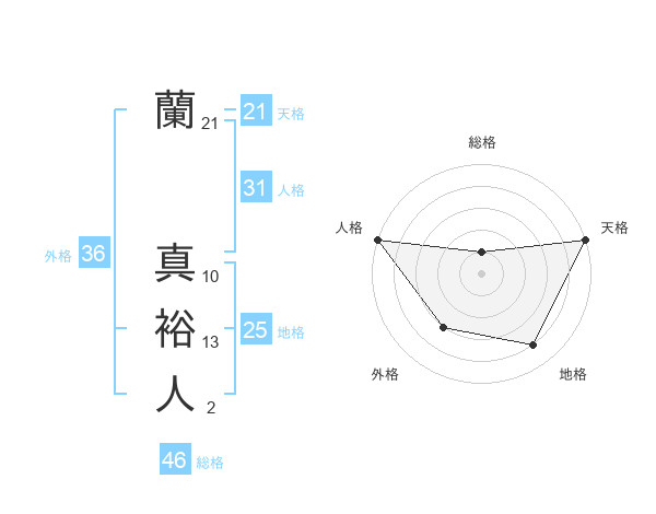 蘭 真裕人さんの天格は21画の5点!