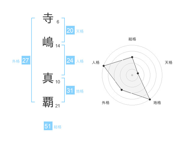 寺嶋 真覇さんを姓名の画数から五運を鑑定