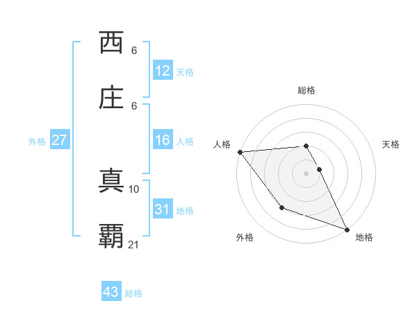 西庄 真覇さんの総格は43画の2点!