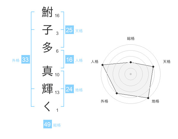 鮒子多 真輝くさんの総格は49画の2点!