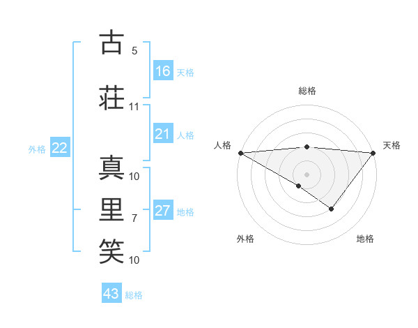 古荘 真里笑さんを姓名の画数から五運を鑑定