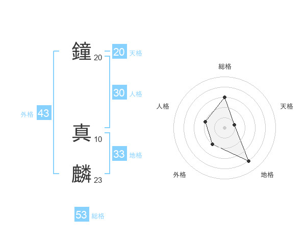 鐘 真麟さんを姓名の画数から五運を鑑定