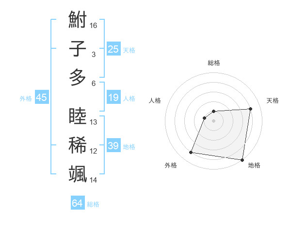 鮒子多 睦稀颯さんの総格は64画の1点!
