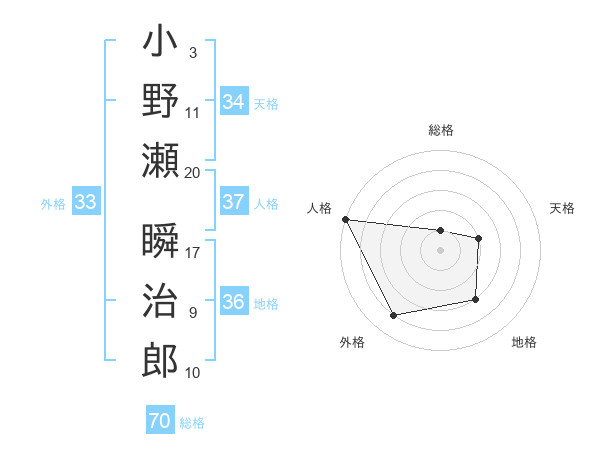 小野瀬 瞬治郎さんの総格は70画の1点!