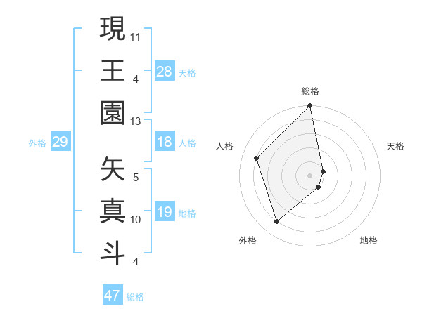 現王園 矢真斗さんの総格は47画の5点