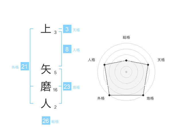 上 矢磨人さんの外格は21画の5点!