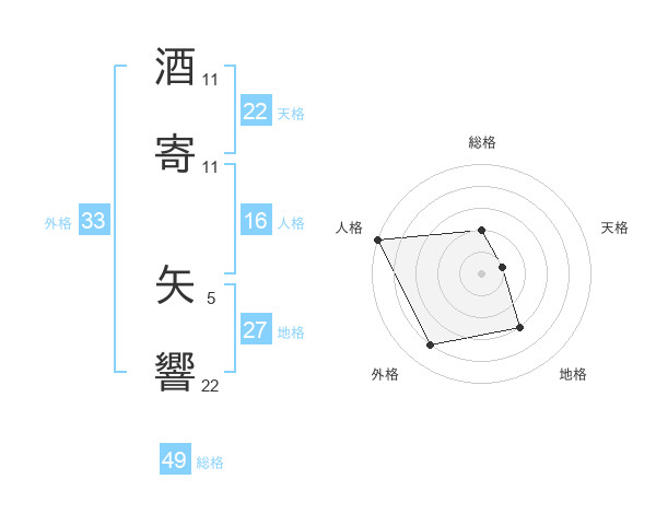 酒寄 矢響さんの総格は49画の2点!