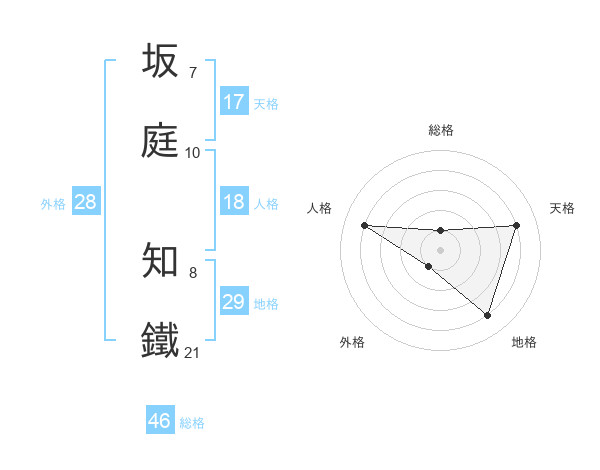 坂庭 知鐵さんの総格は46画の1点!