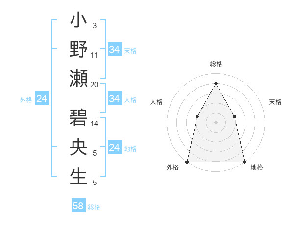 小野瀬 碧央生さんの総格は58画の4点!