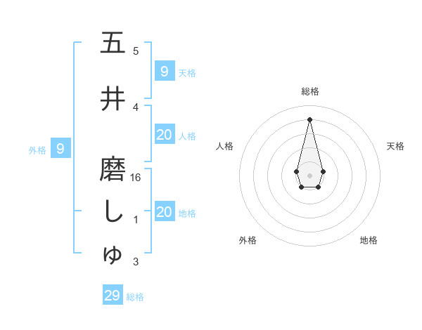 五井 磨しゅさんの総格は29画の4点!