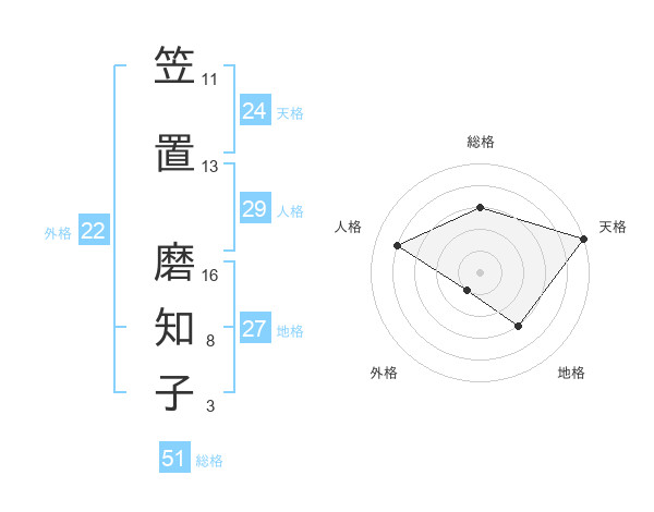 笠置 磨知子さんを姓名の画数から五運を鑑定