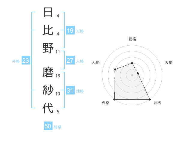 日比野 磨紗代さんを姓名の画数から五運を鑑定