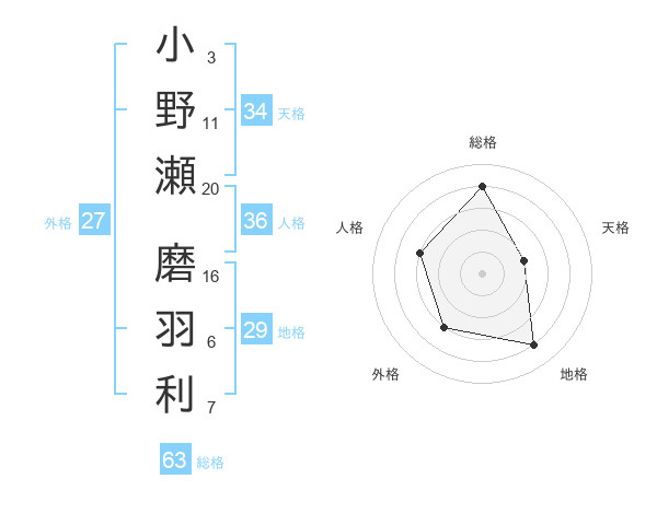 小野瀬 磨羽利さんを姓名の画数から五運を鑑定
