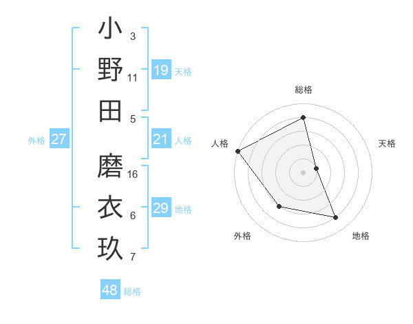 小野田 磨衣玖さんを姓名の画数から五運を鑑定