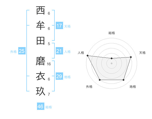 西牟田 磨衣玖さんの天格は17画の4点!