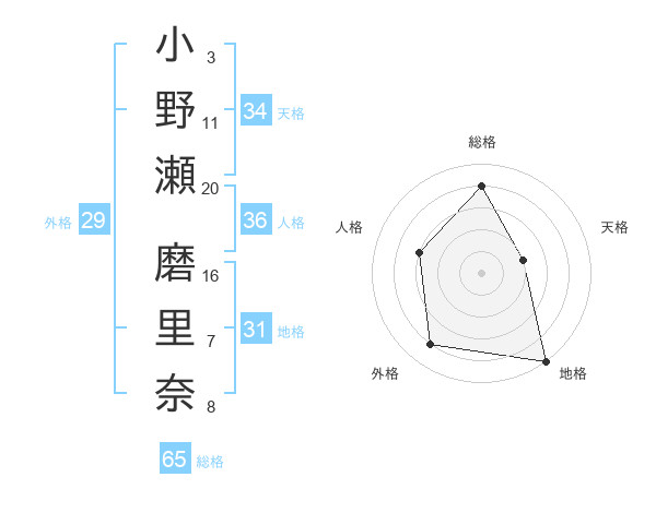 小野瀬 磨里奈さんの総格は65画の4点