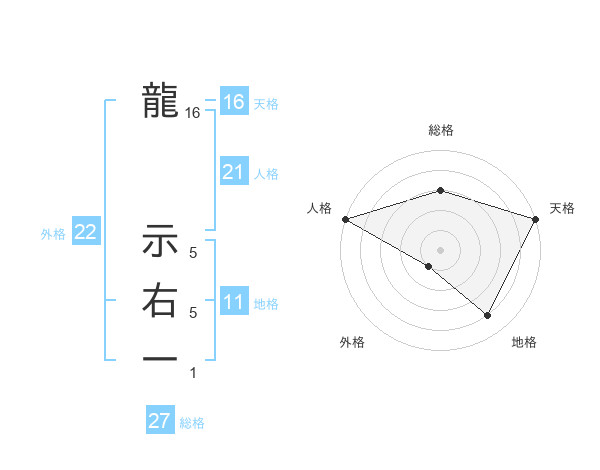 龍 示右一さんの天格は16画の5点!