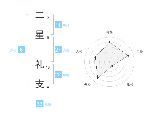 二星 礼支さんの総格は33画の4点!