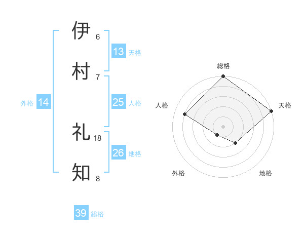 伊村 礼知さんの総格は39画の5点!