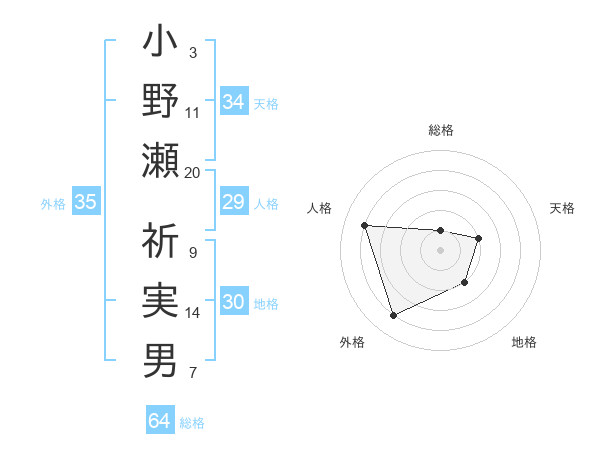 小野瀬 祈実男さんを姓名の画数から五運を鑑定