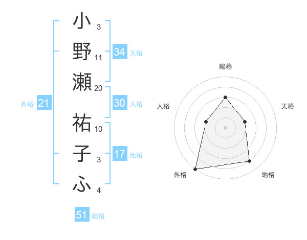 小野瀬 祐子ふさんを姓名の画数から五運を鑑定
