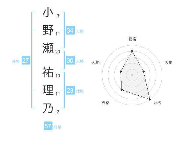 小野瀬 祐理乃さんの総格は57画の4点!