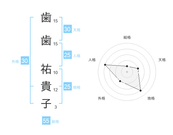 歯歯 祐貴子さんの総格は55画の1点!