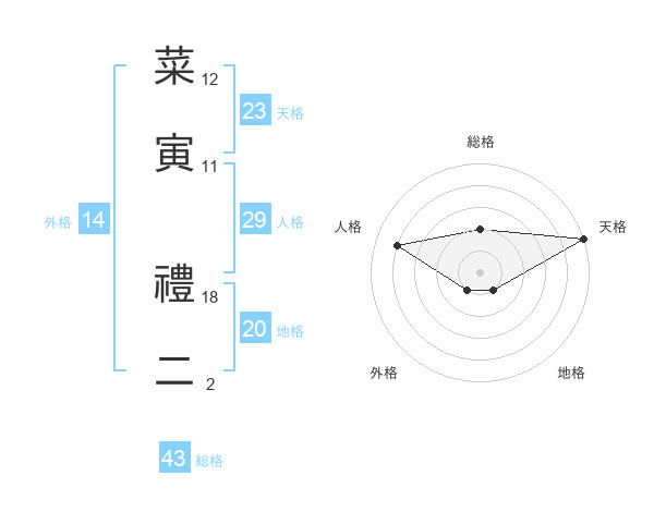 菜寅 禮二さんの天格は23画の5点!