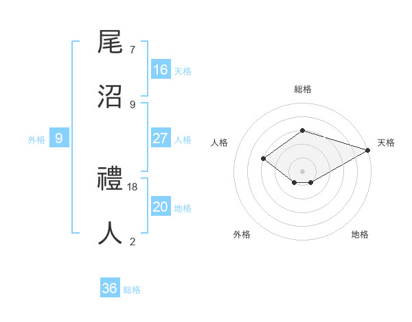 尾沼 禮人さんの天格は16画の5点!