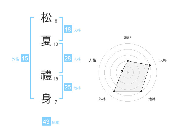 松夏 禮身さんの総格は43画の2点!