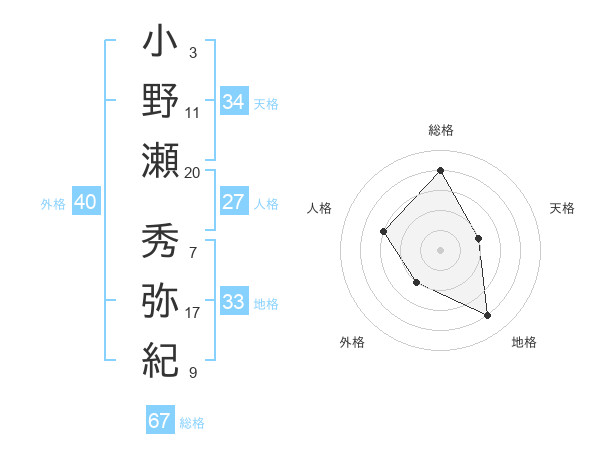 小野瀬 秀弥紀さんの総格は67画の4点!