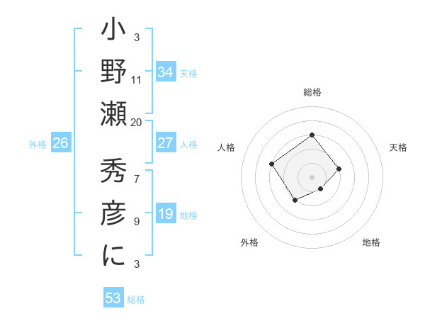 小野瀬 秀彦にさんの総格は53画の3点!
